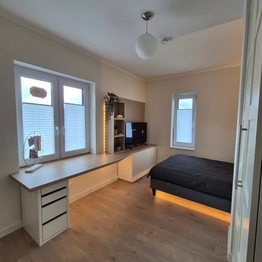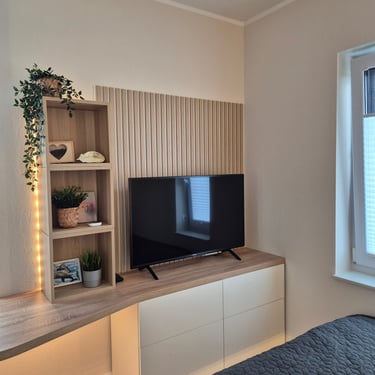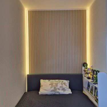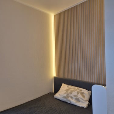 In diesem Projekt wurde ein Schlafzimmer komplett neu gestaltet, mit klaren Linien und einem besonderen Fokus auf stimmungsvolles Licht.