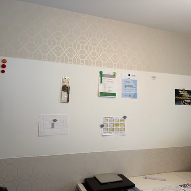 In diesem Büro wurde eine magnetische Tapete verarbeitet, die nicht nur dekorativ ist, sondern auch als unsichtbare Magnetwand dient. Ideal für Besprechungsräume, Homeoffices oder kreative Arbeitsbereiche – Notizen, Pläne oder Moodboards lassen sich direkt an der Wand befestigen – ohne Bohrlöcher oder Whiteboards.