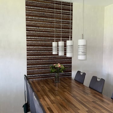 In diesem modernen Esszimmer wurde eine exklusive Capiz-Tapete (Modell CAP11) von Omexco / Arte verarbeitet. Die natürliche Struktur und die schimmernden Elemente setzen ein klares Highlight und sorgen für eine stilvolle, warme Atmosphäre.