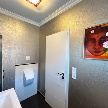 In diesem WC wurde eine hochwertige Korktapete tapeziert. Die goldene Farbe wirkt eindrucksvoll.