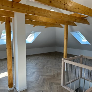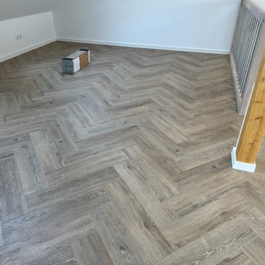 Für dieses Projekt haben wir hochwertigen Designbelag im klassischen Fischgrätenmuster verlegt. Das Ergebnis: ein zeitloser Look, der Wärme und Stil in den Raum bringt und die Handwerkskunst in den Vordergrund stellt.